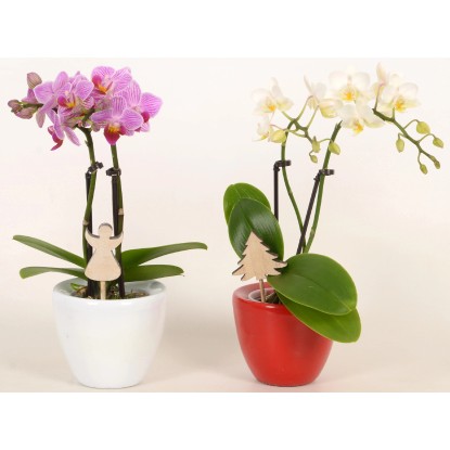 La piccola composizione è composta da una mini orchidea che viene venduta in vaso in cermaica di diametro 6 cm disponibile in ceramica bianca o rossa.