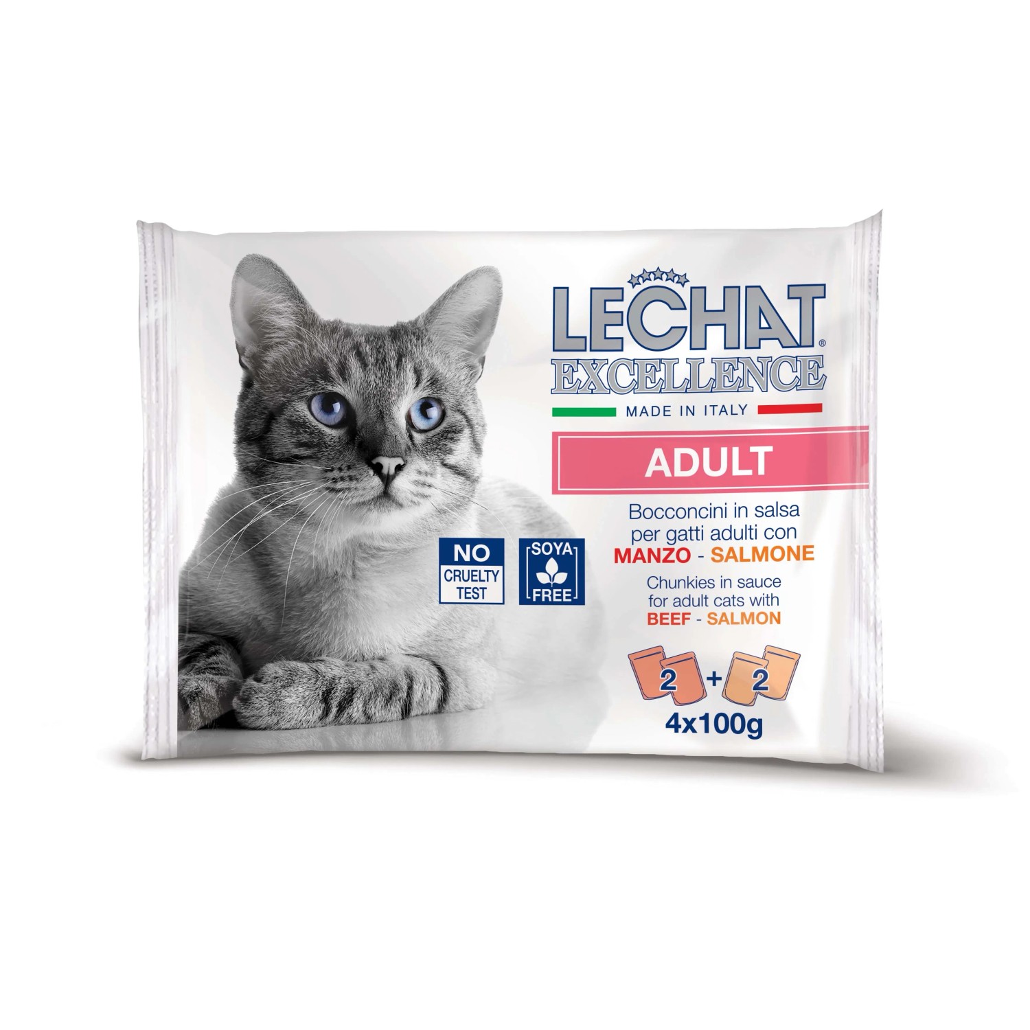 Il cibo umido per gatti LeChat Excellence Bocconcini con manzo e salmone sono un alimento completo per gatti adulti di età superiore ai 12 mesi. Una deliziosa ricetta Made in Italy, senza coloranti, conservanti artificiali e zuccheri aggiunti. Le Chat Excellence è una linea di prodotti pensata per offrire il meglio al tuo gatto. Un'alimentazione completa e bilanciata, formulata specificatamente per favorire il benessere quotidiano del tuo gatto nel rispetto dei suoi fabbisogni nutrizionali.