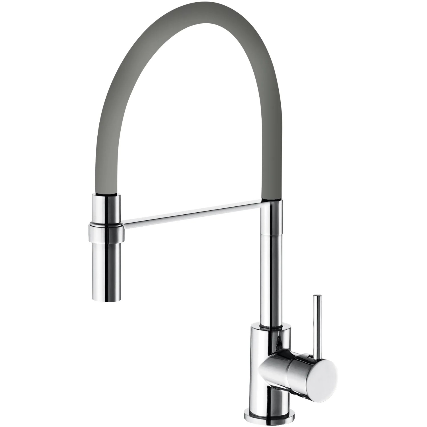 Miscelatore monocomando Winter a bocca alta per lavello, con doccetta monogetto orientabile in ottone. Dotato di una finitura cromata, un tubo in gomma grigio, leva in metallo, cartuccia a dischi ceramici Ø 35 mm e flessibili inox.