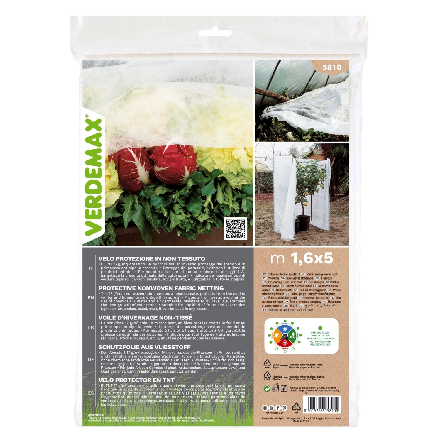 Dimensioni: Il velo di protezione è disponibile nelle dimensioni di 1,6 x 5 metri, offrendo un`ampia superficie di copertura per le piante.