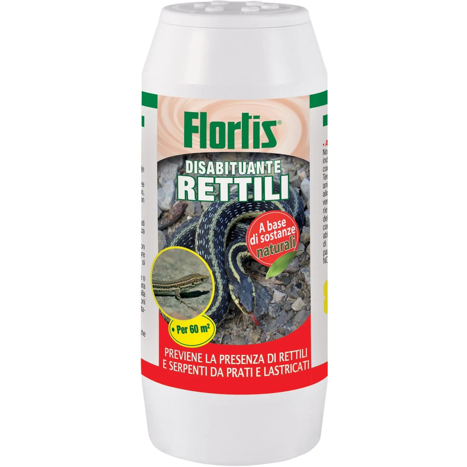 Flortis disabituante rettili previene in modo la presenza di serpenti (e rettili in genere) nelle aree esterne. Il prodotto può essere applicato in tutti i luoghi dove si vuole prevenire il fenomeno (giardini, campeggi, cataste di legna etc.). Il prodotto è a base di oli essenziali le cui fragranze sono sgradevoli ai rettili. Il prodotto, se correttamente usato, non è pericoloso per persone, animali e piante e non è dannoso per l`ambiente. Cospargere la zona interessata con circa 15 g di prodotto (idoneo per circa 1 m²) oppure lungo i percorsi seguiti dai rettili e i luoghi dove si sospetti la loro presenza. La sua efficacia dura circa una settimana: trattare quindi l`area fino alla scomparsa dell`infestazione. Piogge ed irrigazioni abbondanti possono ridurre l`efficacia del trattamento.