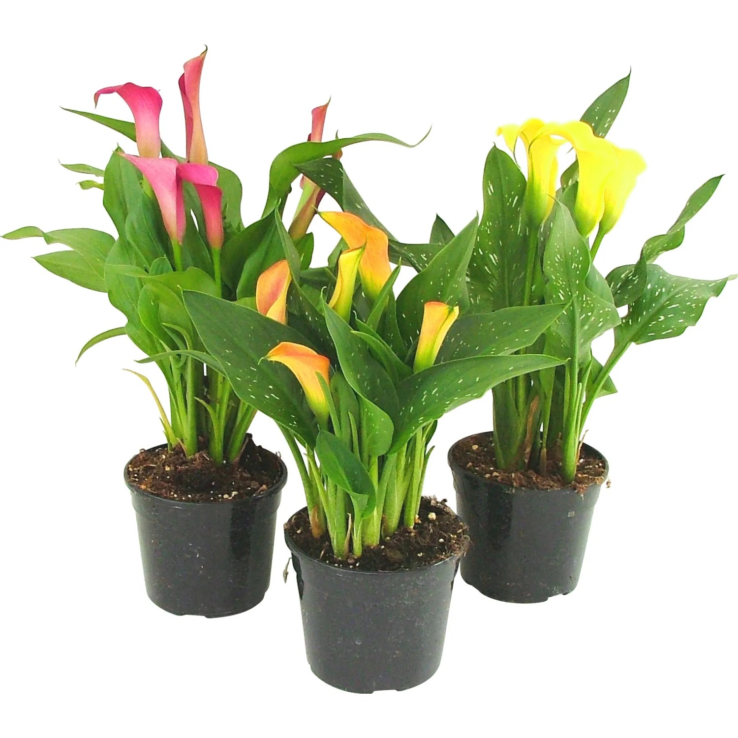La Calla è una pianta molto elegante la quale si può coltivare in terra o in vaso. La loro particolarità è la mancanza di fusto, crescono infatti direttamente da un rizoma sotterraneo (fusto perenne, per lo più sotterraneo e funzionante come organo di riserva simile a una radice provvisto di gemme nella parte superiore e radici in quella inferiore) che rappresenta la radice della pianta ed è anche l`organo di moltiplicazione. Dal rizoma nascono direttamente le foglie che possono essere lanceolate, sagittate, ovate o cuoriformi con margini ondulati, molto grandi, verdi o variamente screziate. Occorre porre attenzione alla temperatura e all`esposizione per non rovinare la pianta. Disponibile in diversi colori.