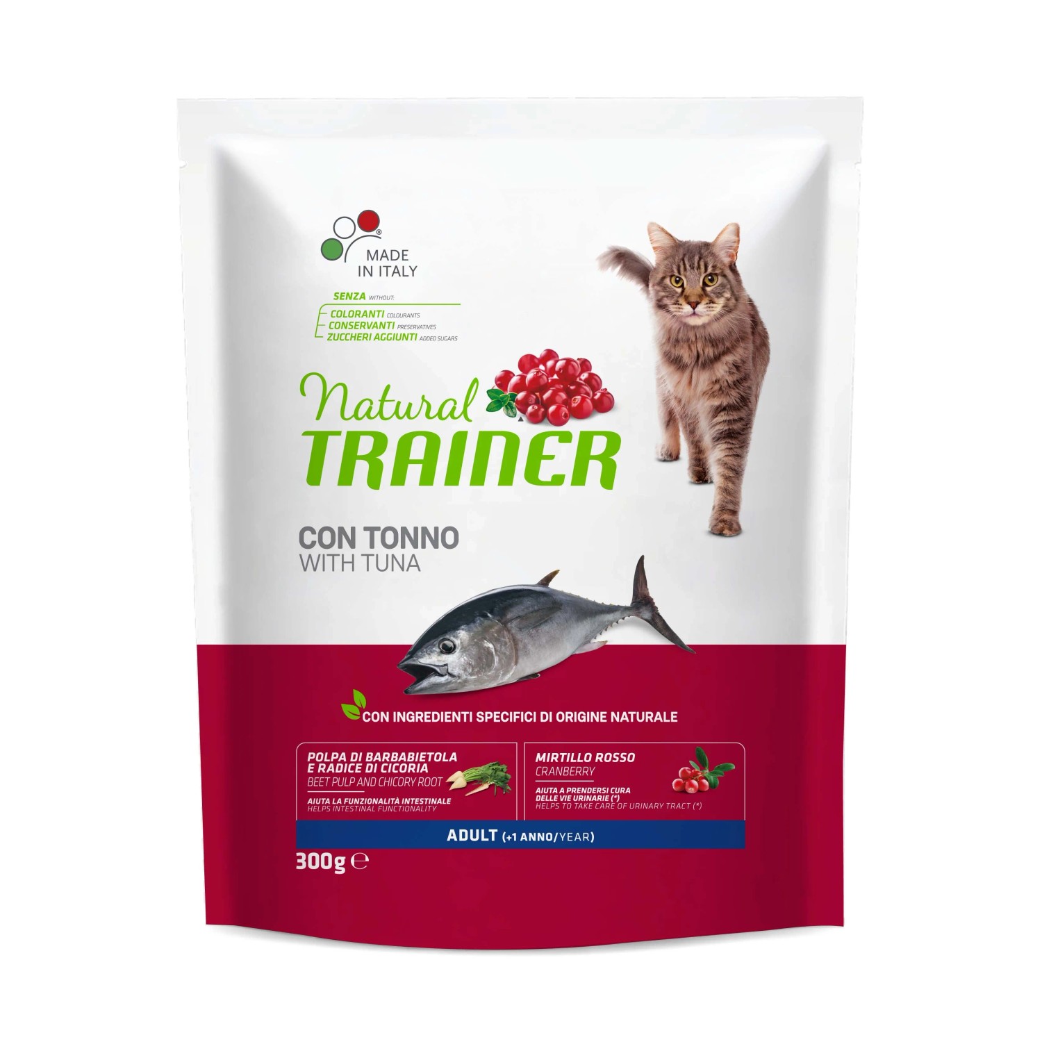 ALIMENTO COMPLETO ED EQUILIBRATO PER GATTI ADULTI, DA 1 ANNO DI ETÀ. Natural Trainer Adult con Tonno per Gatto alimento completo ed equilibrato per gatti adulti, da 1 anno d`età. Crocchette per gatti adulti ricche di tonno, mirtilli rossi e con polpa di barbabietola e cicoria che aiutano la funzionalità intestinale, l` igiene orale e la pelle in salute e pelo lucido. I prebiotici di origine , provenienti dall`estratto di radice di cicoria e dalla polpa di barbabietola, aiutano il nutrimento e il corretto equilibrio del microbiota intestinale. L`estratto secco di mela e una speciale forma di vitamina C aiutano a prevenire la formazione di tartaro e a controllare l`alito cattivo. Acidi grassi omega-3 e omega-6, biotina e zinco per il benessere della pelle e la bellezza del pelo. COMPOSIZIONE: pollo fresco, granturco, riso, proteine disidratate di pollo e tacchino, proteina di granturco, proteine disidratate di tonno 7%, piselli disidratati, strutto, tonno 4%, proteine disidratate di manzo, fioretto di granturco, polpa di barbabietola* 2%, proteine animal idrolizzate (pollame, maiale, pesce), semi di lino*, proteina di pisello, concentrato secco di radice di cicoria (fonte di inulina)* 0,8%, sostanze minerali, olio di granturco, mirtillo rosso disidratato* 0,02%.*Ingredienti specifici di origine . ADDITIVI PER KG - ADDITIVI NUTRIZIONALI: vitamina A 27000 UI, vitamina D3 1200 UI, vitamina E 510 mg, biotina 1 mg, taurina 2000 mg, solfato di rame(II) pentaidrato 33 mg (rame 8,8 mg), solfato di ferro(II) monoidrato 260 mg (ferro 86 mg), ioduro di potassio 1,9 mg (iodio 1,4 mg), selenito di sodio 0,2 mg (selenio 0,1 mg), solfato di zinco monoidrato 405 mg (zinco 148 mg), solfato manganoso monoidrato 123 mg (manganese 40 mg). Additivi zootecnici: cloruro di ammonio 5 g. COMPONENTI ANALITICI: proteina grezza 33%, grassi grezzi 15%, fibra grezza 2,5%, ceneri grezze 6,7%, omega 3 0,85%, omega 6 2,75%.