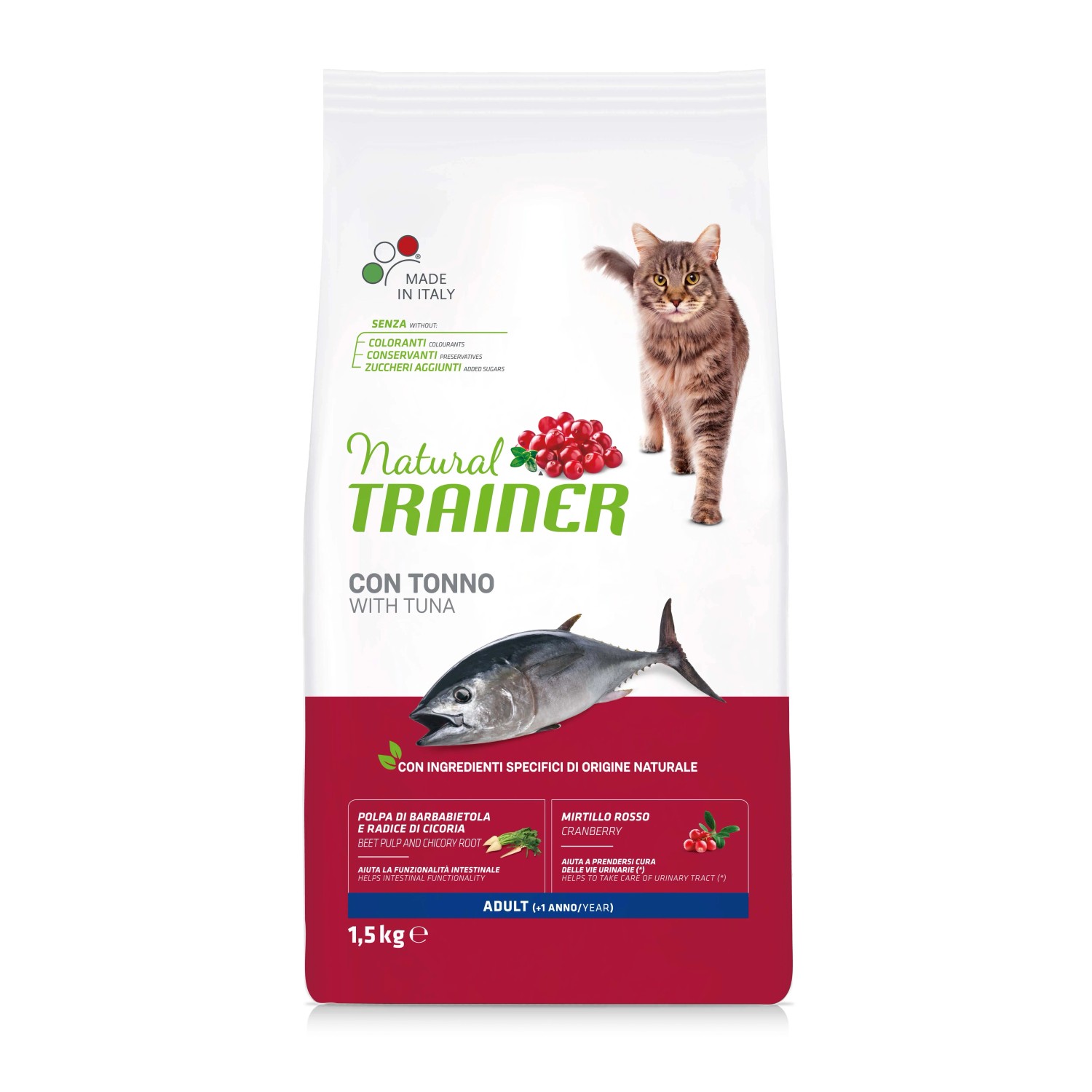 ALIMENTO COMPLETO ED EQUILIBRATO PER GATTI ADULTI, DA 1 ANNO DI ETÀ. Natural Trainer Adult con Tonno per Gatto alimento completo ed equilibrato per gatti adulti, da 1 anno d`età. Crocchette per gatti adulti ricche di tonno, mirtilli rossi e con polpa di barbabietola e cicoria che aiutano la funzionalità intestinale, l` igiene orale e la pelle in salute e pelo lucido. I prebiotici di origine , provenienti dall`estratto di radice di cicoria e dalla polpa di barbabietola, aiutano il nutrimento e il corretto equilibrio del microbiota intestinale. L`estratto secco di mela e una speciale forma di vitamina C aiutano a prevenire la formazione di tartaro e a controllare l`alito cattivo. Acidi grassi omega-3 e omega-6, biotina e zinco per il benessere della pelle e la bellezza del pelo. COMPOSIZIONE: pollo fresco, granturco, riso, proteine disidratate di pollo e tacchino, proteina di granturco, proteine disidratate di tonno 7%, piselli disidratati, strutto, tonno 4%, proteine disidratate di manzo, fioretto di granturco, polpa di barbabietola* 2%, proteine animal idrolizzate (pollame, maiale, pesce), semi di lino*, proteina di pisello, concentrato secco di radice di cicoria (fonte di inulina)* 0,8%, sostanze minerali, olio di granturco, mirtillo rosso disidratato* 0,02%.*Ingredienti specifici di origine . ADDITIVI PER KG - ADDITIVI NUTRIZIONALI: vitamina A 27000 UI, vitamina D3 1200 UI, vitamina E 510 mg, biotina 1 mg, taurina 2000 mg, solfato di rame(II) pentaidrato 33 mg (rame 8,8 mg), solfato di ferro(II) monoidrato 260 mg (ferro 86 mg), ioduro di potassio 1,9 mg (iodio 1,4 mg), selenito di sodio 0,2 mg (selenio 0,1 mg), solfato di zinco monoidrato 405 mg (zinco 148 mg), solfato manganoso monoidrato 123 mg (manganese 40 mg). Additivi zootecnici: cloruro di ammonio 5 g. COMPONENTI ANALITICI: proteina grezza 33%, grassi grezzi 15%, fibra grezza 2,5%, ceneri grezze 6,7%, omega 3 0,85%, omega 6 2,75%.