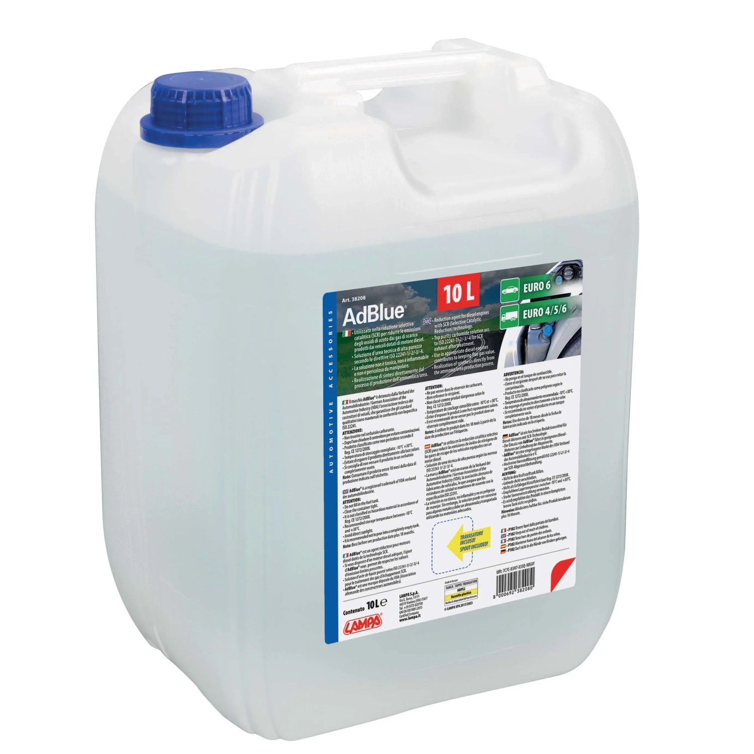 Soluzione di Urea Tecnica: Di alta purezza, prodotta secondo le direttive ISO 22241-1/-2/-3/-4. La soluzione non è tossica, non è infiammabile e non è pericolosa da manipolare, rendendo sicuro il suo utilizzo e stoccaggio. Travasatore Flessibile Integrato: Dotato di un travasatore flessibile integrato nella tanica per facilitare il trasferimento del liquido nel serbatoio del veicolo.