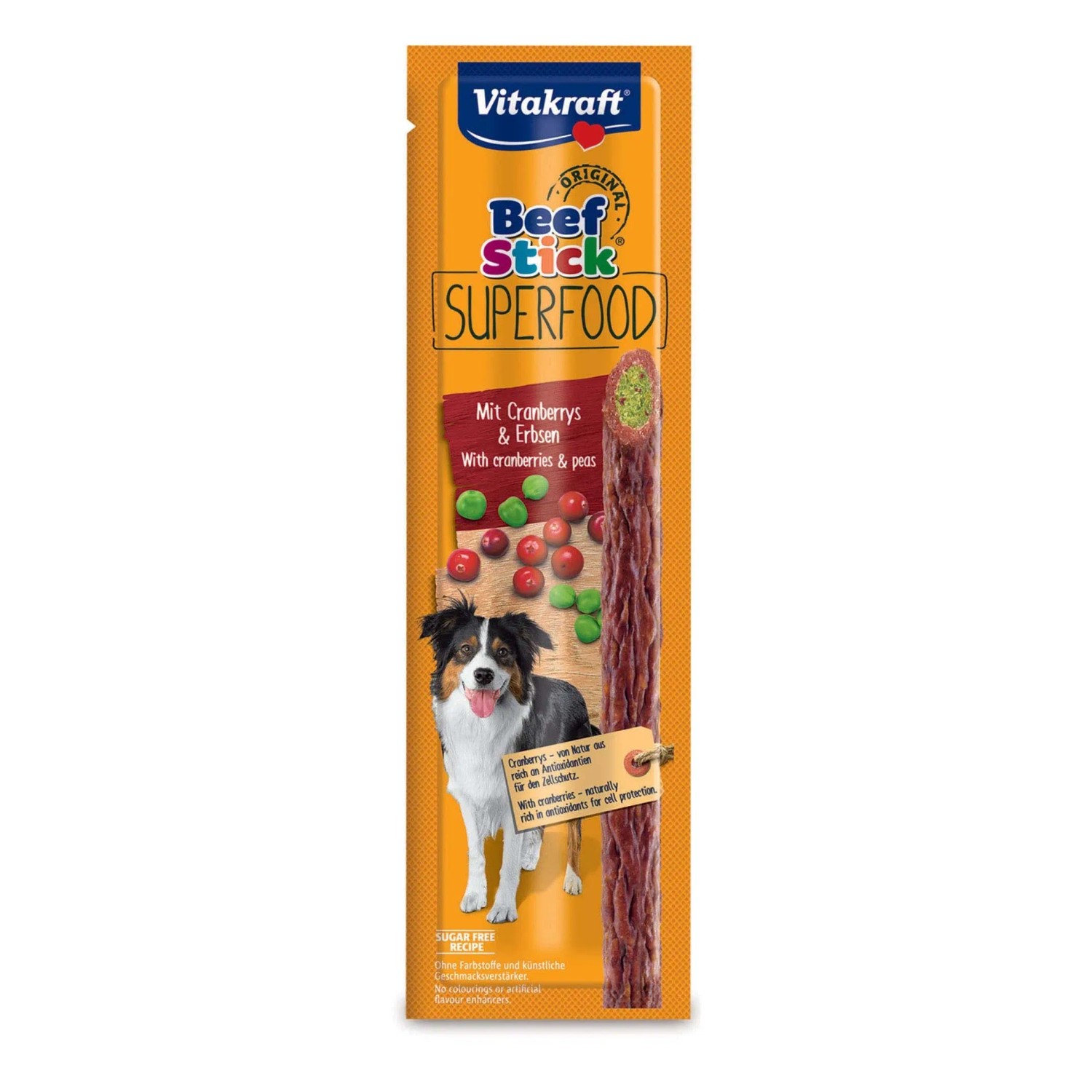 Lo stick per cani carne con piselli e mirtilli è un premio per cani dal gusto unico e irresistibile. Arricchito con superfood, questo stick è avvolto in pregiata carne e ripieno di piselli ricchi di proteine e mirtillo rosso naturalmente ricco di antiossidanti per favorire la protezione delle cellule. La ricetta di questo prodotto non contiene zucchero, coloranti e esaltatori di sapidità artificiali, garantendo un alimento sano e per il tuo cane.
