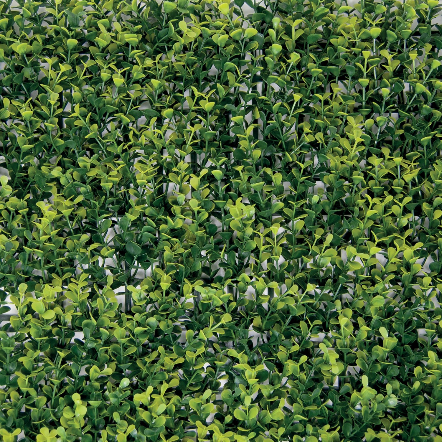 Siepe artificiale a pannelli con foglie in polietilene simili al Bosso. Le foglie 3D riproducono l'aspetto e le gradazioni di colore delle siepi . Le foglie sono applicate su una griglia modulare in plastica. I pannelli si agganciano facilmente l'uno all'altro per ottenere la misura desiderata.