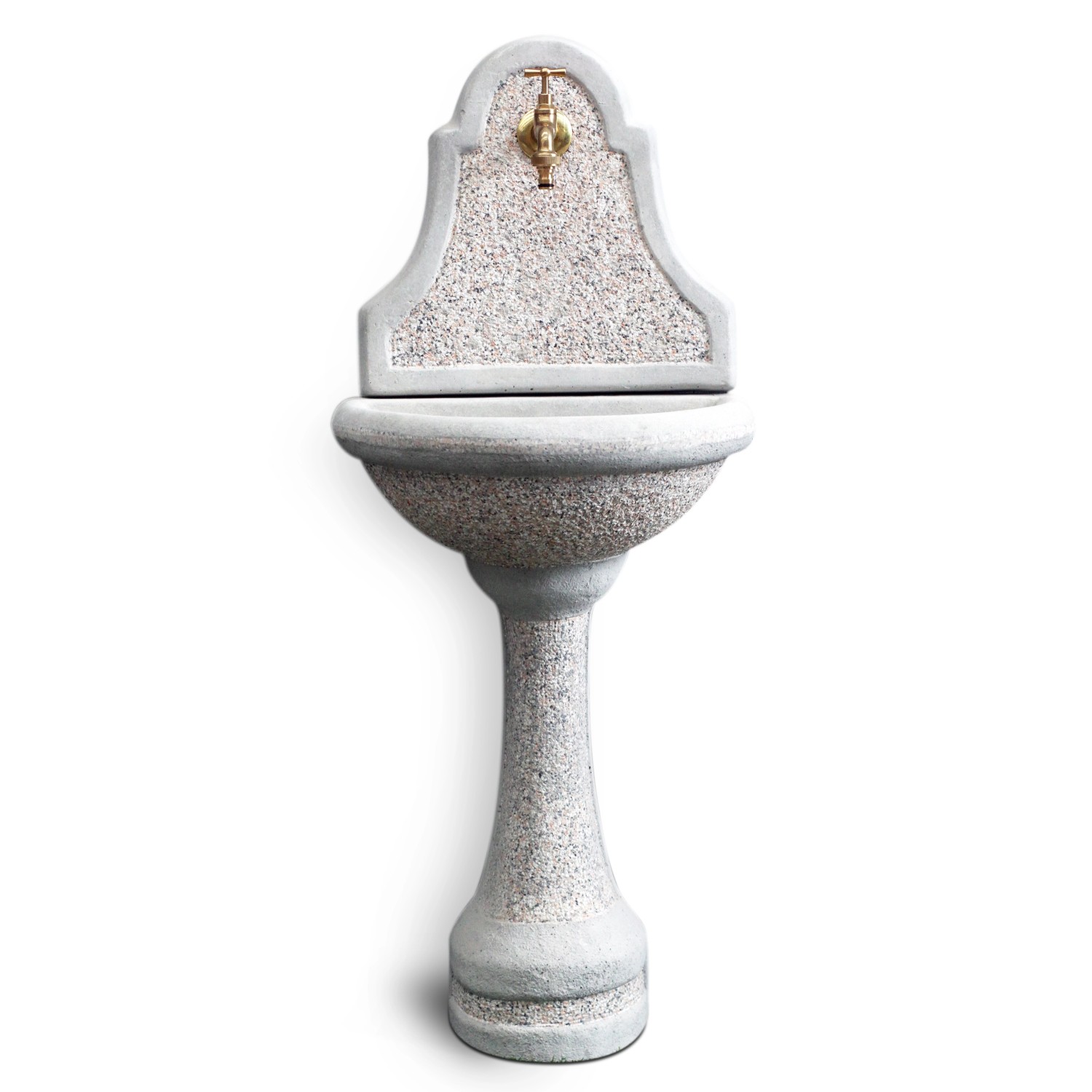 La fontana da giardino a parete Panaro, in calcestruzzo, è realizzata in cemento e granulato di marmo, con rifinitura bocciardato. Le dimensioni ridotte e il peso contenuto ne semplificano il trasporto e l`installazione. Adatta per giardini, ma anche terrazzi e balconi, la fontana è in due pezzi (frontale e vaschetta con piedistallo). L`altezza del rubinetto è collocata a 96,5 cm dalla base e lo scarico è predisposto con un tubo in PVC perpendicolare alla base. Gli accessori non sono inclusi.