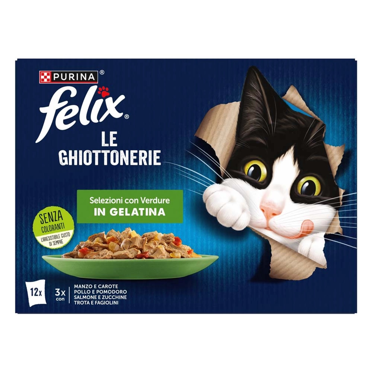 FELIX Le Ghiottonerie con Verdure è una gamma di ricette irresistibili per il tuo gatto, preparate con ingredienti di alta qualità. Ogni pasto contiene bocconcini in gelatina con verdure, per un gusto delizioso che sembrerà fatto in casa! Arricchite con Omega 6 e vitamine, aiutano il tuo gatto a restare pieno di energia e pronto a divertirsi. Soddisfano il 100% del fabbisogno giornaliero, se servite secondo le indicazioni. Disponibili in tante varianti per offrire ogni giorno varietà e gusto. FELIX - Semplicemente irresistibile! Con salmone e zucchine, con manzo e carote, con Pollo e Pomodoro in gelatina