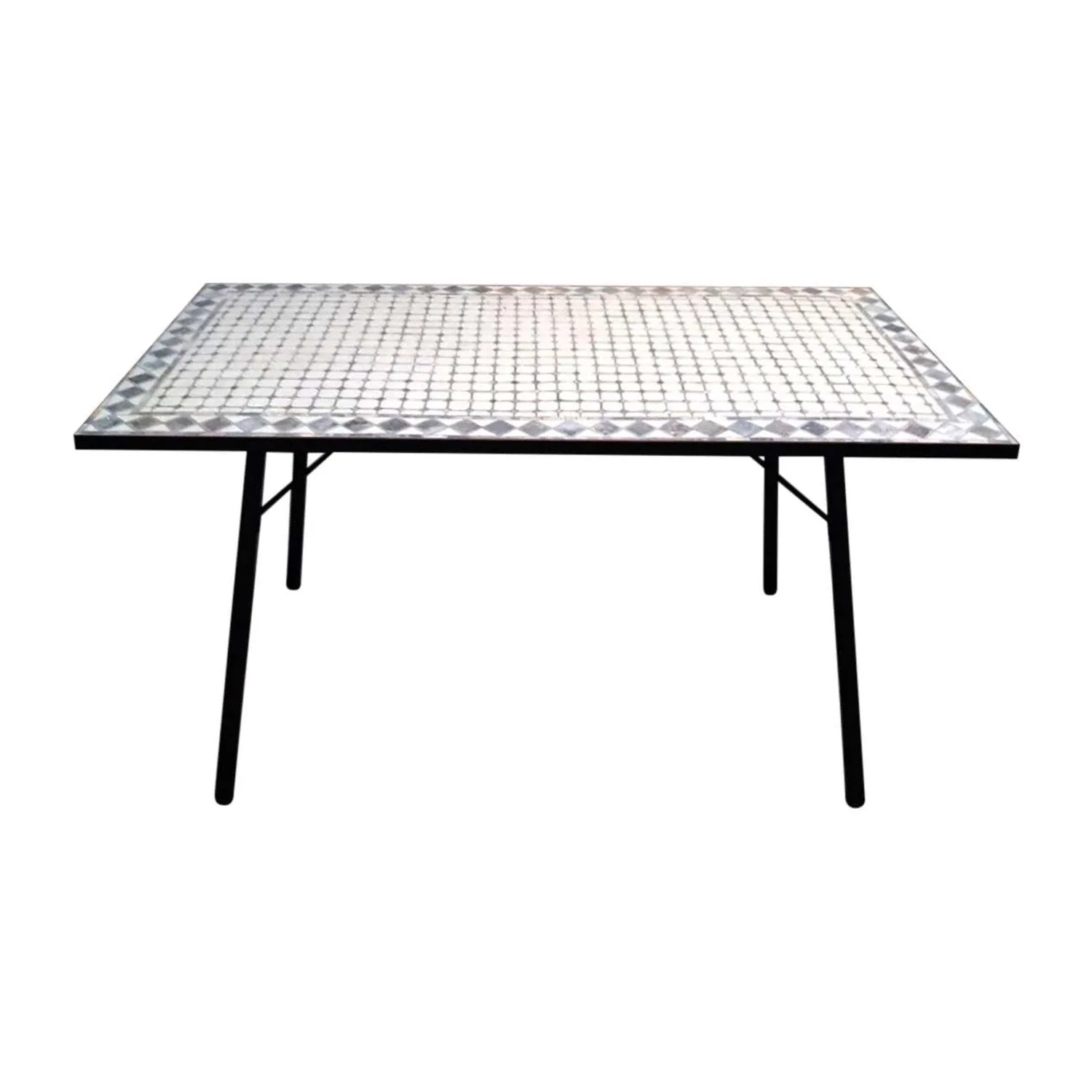 - Struttura robusta: Realizzato in ferro, il tavolo è resistente alle intemperie e agli elementi , garantendo durabilità nel tempo. - Design decorativo: Il motivo geometrico-artistico aggiunge stile e carattere all`ambiente esterno. - Dimensioni: 76x150x90 cm