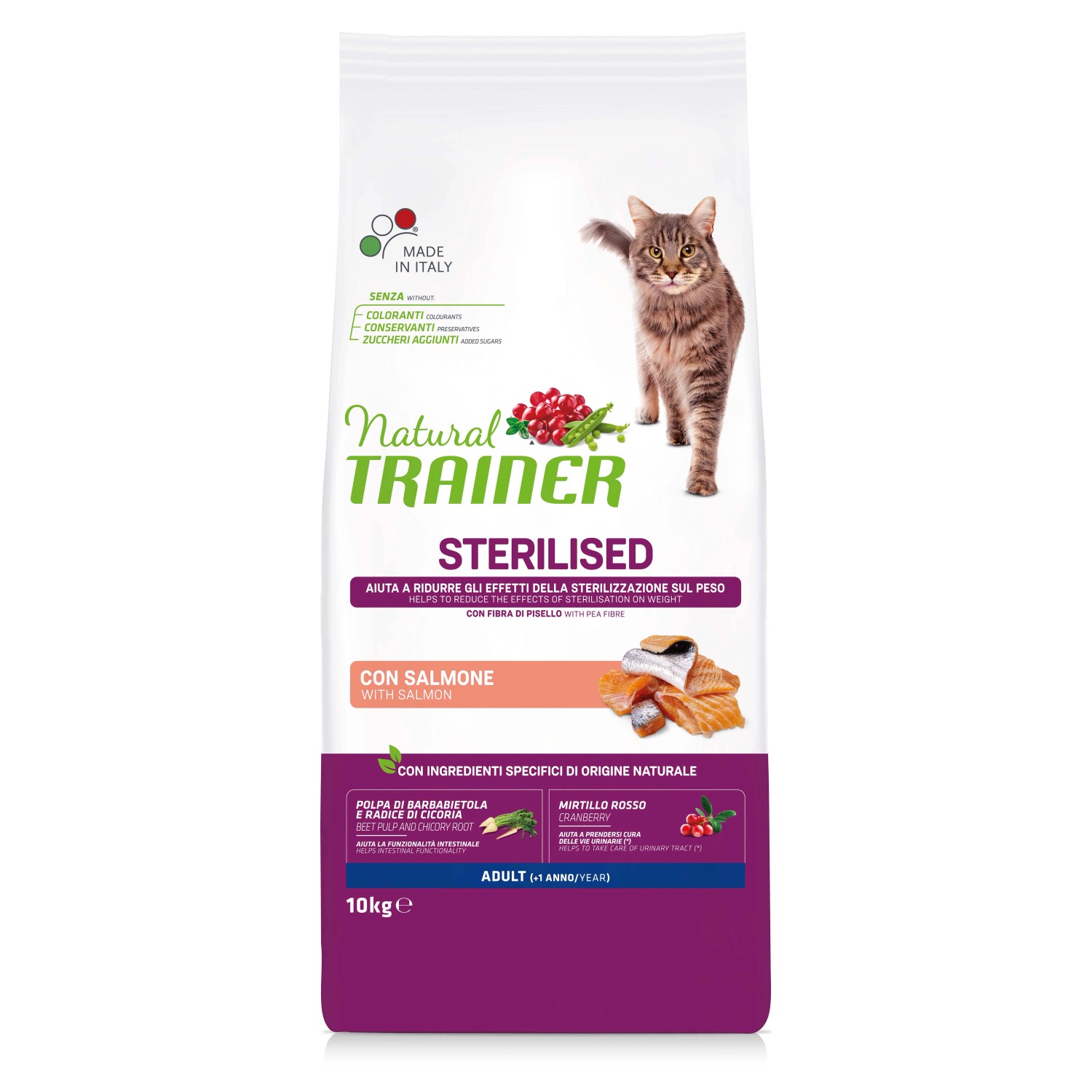 ALIMENTO COMPLETO ED EQUILIBRATO PER GATTI ADULTI STERILIZZATI, DA 1 ANNO DI ETÀ. Trainer Natural Adult Sterilised con Salmone è un alimento completo per gatti sterilizzati da un anno d`età. Il cibo secco Trainer Natural aiuta a mantenere la perfetta forma fisica attraverso una nutrizione mirata a ridotto apporto calorico e realizzata con nobili proteine della carne fresca di pollo e tacchino. Favorisce la freschezza dell`alito grazie all`estratto di menta piperita e del propoli. Consente di cambiare gusto in totale sicurezza e favorisce una corretta digestione grazie ai FOS, Prebiotici e Lievito di birra contenuti. Aiuta a preservare nel tempo la salute e la funzionalità delle vie urinarie attraverso le sostanze benefiche dell`estratto secco di mirtillo rosso. COMPOSIZIONE: pollo fresco, riso, proteina di granturco, proteine disidratate di salmone 10%, proteine disidratate di pollo e tacchino, granturco, fioretto di granturco, piselli disidratati 4,5%, salmone 4%, polpa di barbabietola* 2,5%, proteine disidratate di maiale, fibra di pisello* 2%, proteine animali idrolizzate (pollame, maiale, pesce), strutto, semi di lino*, amido di pisello, sostanze minerali, concentrato secco di radice di cicoria (fonte di inulina)* 0,8%, olio di granturco, mirtillo rosso disidratato* 0,02%. *Ingredienti specifici di origine . ADDITIVI PER KG - ADDITIVI NUTRIZIONALI: vitamina A 27000 UI, vitamina D3 1200 UI, vitamina E 510 mg, biotina 1 mg, taurina 2000 mg, solfato di rame(II) pentaidrato 33 mg (rame 8,8 mg), solfato di ferro(II) monoidrato 260 mg (ferro 86 mg), ioduro di potassio 1,9 mg (iodio 1,4 mg), selenito di sodio 0,2 mg (selenio 0,1 mg), solfato di zinco monoidrato 240 mg (zinco 88 mg), solfato manganoso monoidrato 123 mg (manganese 40 mg). Additivi zootecnici: cloruro di ammonio 5 g. Energia metabolizzabile: 3775 kcal/kg. COMPONENTI ANALITICI: proteina grezza 35%, grassi grezzi 12%, fibra grezza 4%, ceneri grezze 7%, omega 3 0,8%, omega 6 2,6%.