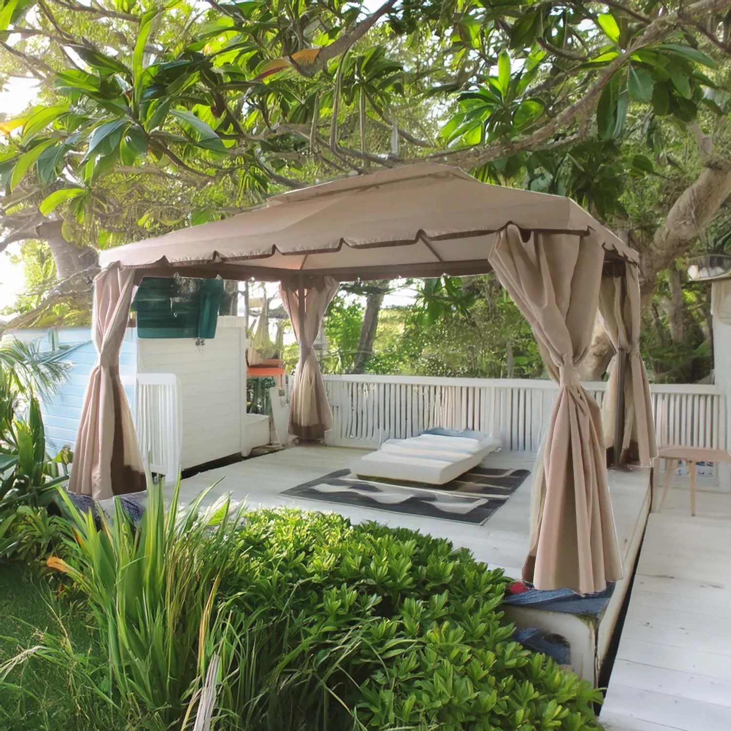 Il gazebo in alluminio e poliestere 280x400x300 cm offre una copertura spaziosa e resistente per il tuo spazio esterno, realizzato in poliestere 220gr e dotato di un doppio tetto per una migliore ventilazione. Con tende laterali e zanzariera incluse, garantisce protezione contro insetti e vento.