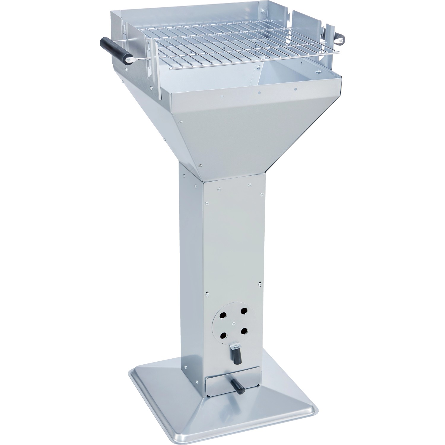 Il grill a carbonella quadrato a colonna è utilizzato per cucinare cibi in giardino, sul balcone o in terrazza. È adatto per la cottura alla griglia diretta. Inoltre è dotato di una griglia cromata che ha dimensioni rettangolari 37,8 x 35,2 cm (L x P). Può essere regolato in altezza in due posizioni. A questo scopo, la griglia ha due maniglie esterne in plastica. L`alloggiamento sporgente funge da paravento per gli alimenti da grigliare. Il corpo grigliante a forma di imbuto è montato su una base in acciaio per un`altezza d`uso ideale. È integrata una ventilazione regolabile e un cassetto per la cenere estraibile per una facile pulizia. Le dimensioni sono 92 cm x 52 cm x 38,5 cm (H x L x P).