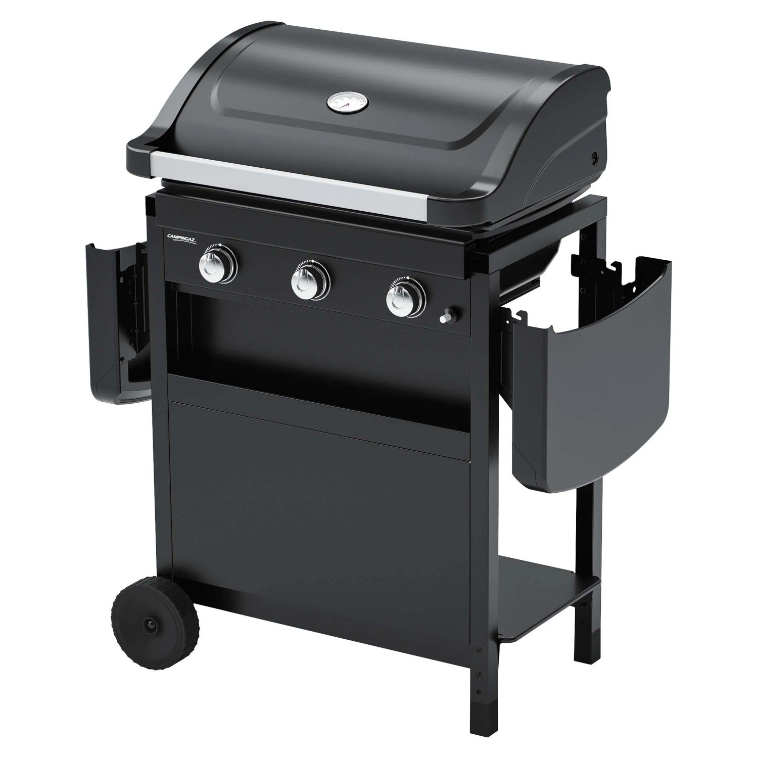 Numero bruciatori: 3 bruciatori principali Tipo bruciatori: acciaio alluminato Potenza: 7.500 W Accensione: elettronica Regolazione della temperatura: indipendente per ogni bruciatore Cottura alla griglia: diretta e indiretta Termometro: integrato nel coperchio Comandi: manopole frontali