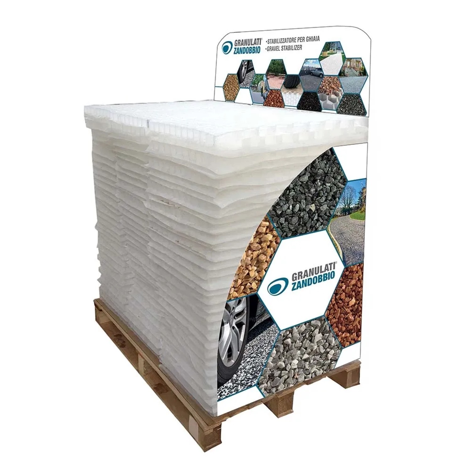 Stabilizzatore per ghiaia progettato per risolvere le tipiche problematiche di spostamenti dovuti al passaggio veicolare nei parcheggi o nelle zone di transito.