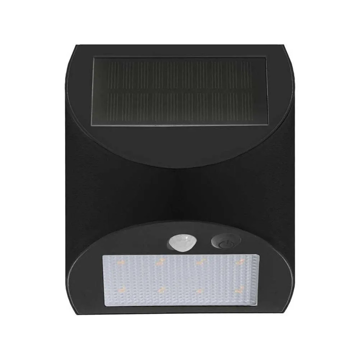 Lampada da parete a LED con pannello solare integrato, ideale per illuminare spazi esterni senza necessità di collegamento elettrico. Design compatto e moderno, finitura nera (RAL 9005).