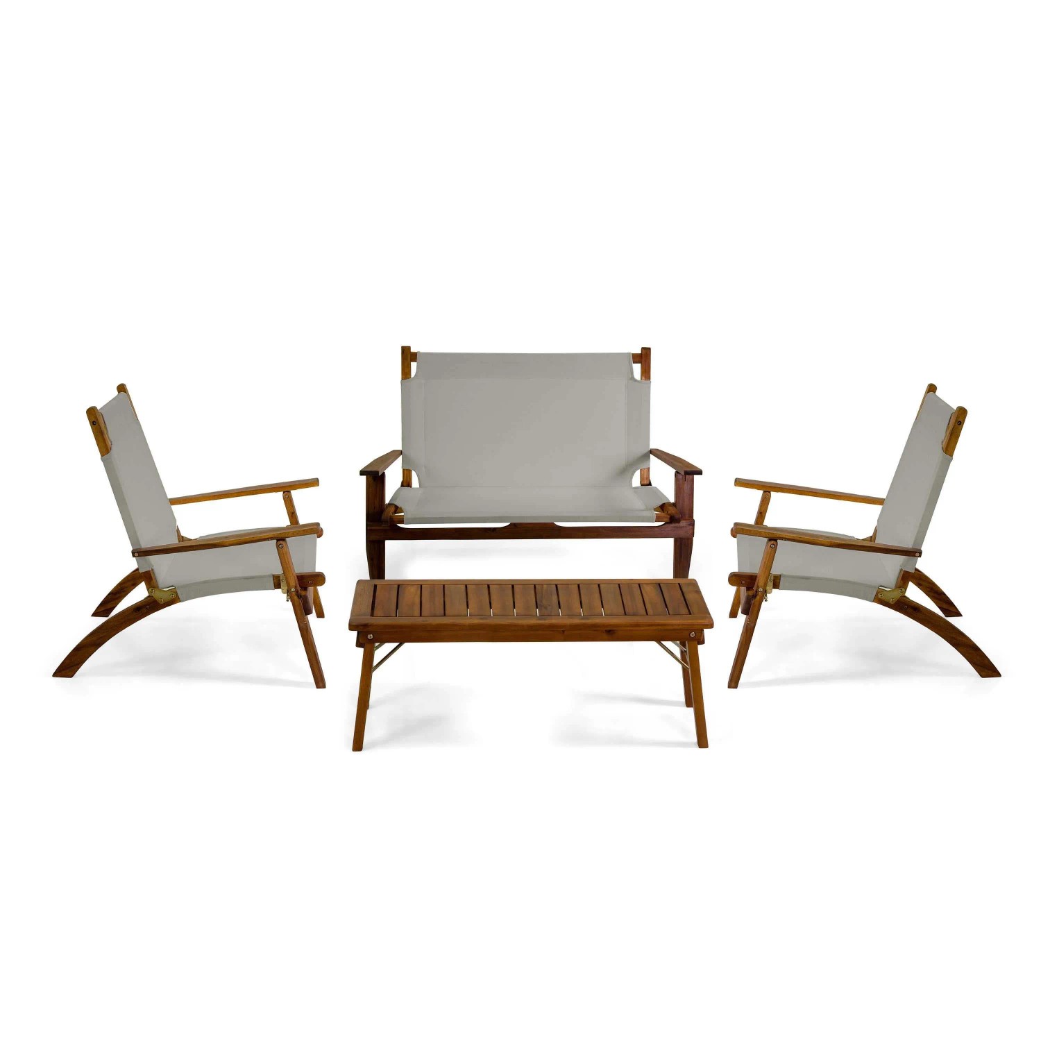 Struttura in legno di acacia oliata colore naturale. Seduta in tessuto misto cotone/poliestere 360gr colore grigio. Misure: - Poltrone cm76x89h91 - Divano 2 posti cm127x89h91 - Tavolino cm100x50h37. Articolo in legno NON FSC. Arreda il tuo giardino con soluzioni eleganti e confortevoli, ideali per creare ambienti accoglienti e vivere al meglio l`aria aperta. Ideali per esterni e interni, i nostri set valorizzano portici, salotti e taverne offrendo comfort, durata e uno stile sempre attuale.