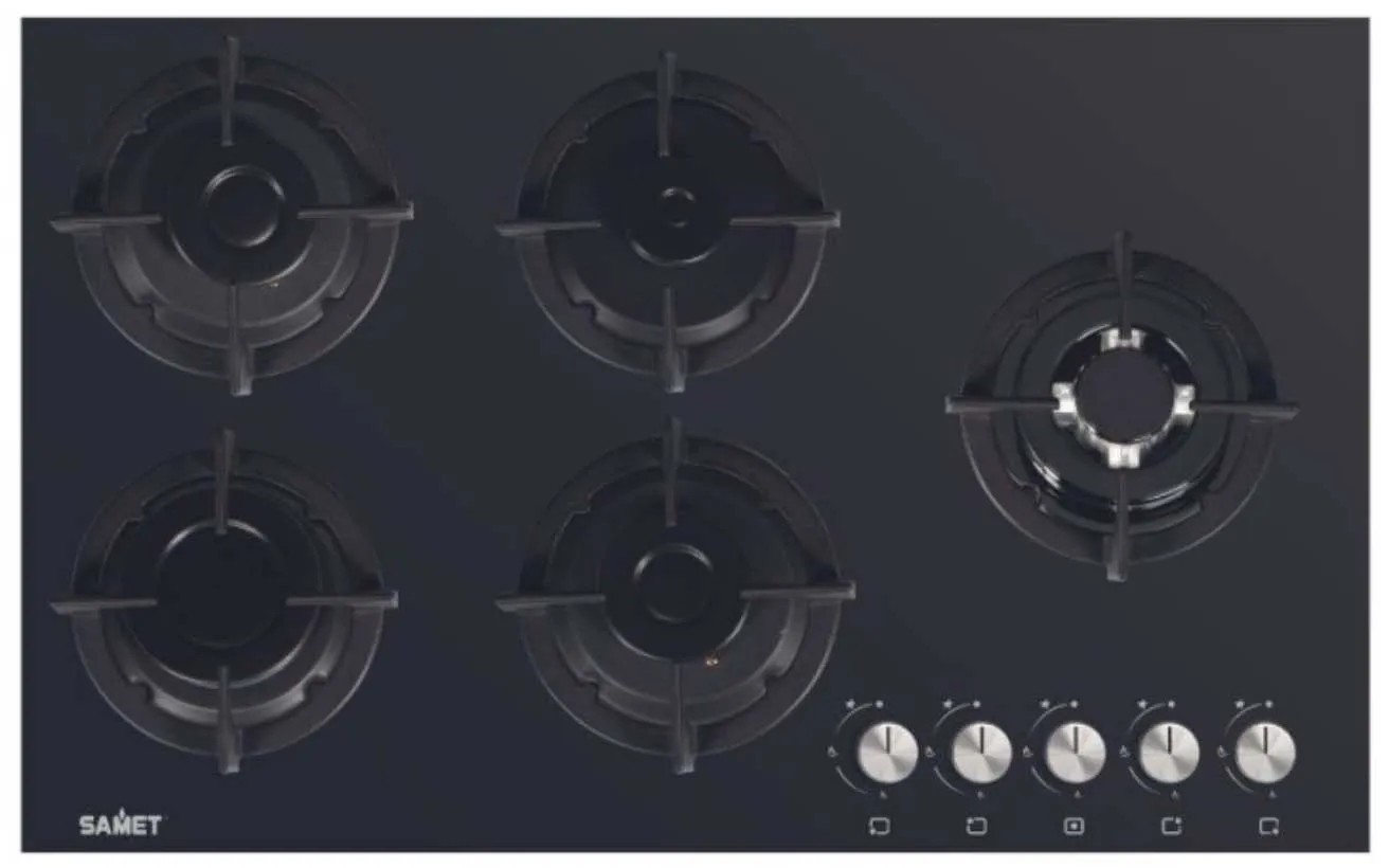 Con un ampio piano in vetro dalle dimensioni di 90x51 cm, questo piano cottura presenta cinque fuochi e griglie in ghisa, combinando stile e funzionalità.