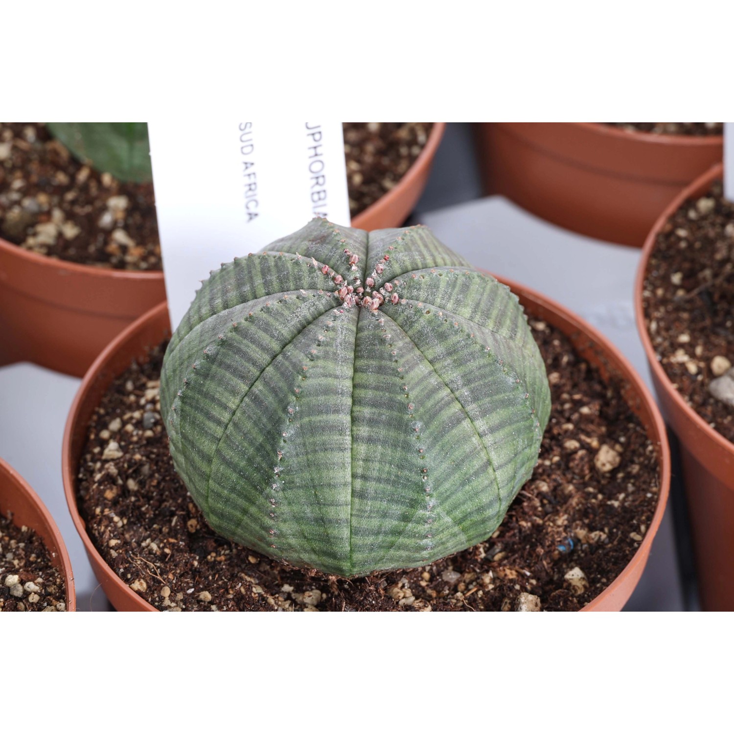 L`Euphorbia obesa è una succulenta unica e affascinante, nota per il suo portamento globoso che ricorda una sfera perfetta. Originaria del Sudafrica, questa pianta è caratterizzata da una superficie liscia, verde-grigia, attraversata da leggere striature o linee che possono variare dal verde al rossastro in base all`esposizione solare. La sua struttura simmetrica e globosa può diventare leggermente colonnare con l`età. Generalmente raggiunge un diametro di 6-15 cm. Produce piccoli fiori gialli-verdi, chiamati ciazzi, che sbocciano alla sommità della pianta. Posizionala in un luogo luminoso, con luce indiretta o sole parziale. Evita l`esposizione diretta troppo intensa nelle ore più calde. Utilizza un substrato ben drenante, come un mix per piante grasse o cactus. Innaffia moderatamente in primavera ed estate, aspettando che il terreno sia completamente asciutto tra un`irrigazione e l`altra. Sospendi quasi del tutto le annaffiature in inverno. Somministra un fertilizzante specifico per piante grasse una volta al mese durante la stagione di crescita.