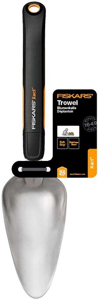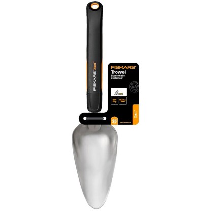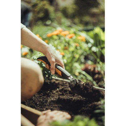 La leggera paletta per fiori Xact di Fiskars è adatta per piantare e trapiantare facilmente in fioriere, vasi, aiuole e su tombe. Può anche essere utilizzata per scavare la terra. È realizzata in acciaio inossidabile e plastica rinforzata con fibre di vetro.