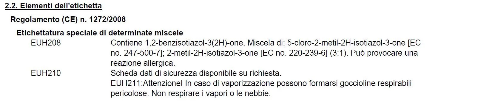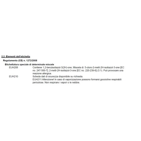 | | EUH208-EUH210 | (00|EUH211: Attenzione! In caso di vaporizzazione possono formarsi goccioline respirabili pericolose. Non respirare i vapori o le nebbie.|)