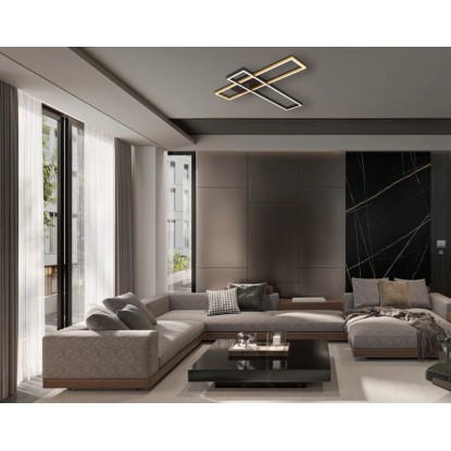Scopri l`eleganza della lampada da soffitto DAKARI, una plafoniera dal design moderno e raffinato. Realizzata in metallo nero opaco, alluminio nero e oro e con un elegante paralume in plastico opalino, questa lampada è perfetta per aggiungere un tocco di classe e illuminazione di alta qualità ai tuoi spazi. Con dimensioni di 80x60x7,5 cm, la DAKARI è ideale per ambienti ampi come soggiorni, sale da pranzo o corridoi.