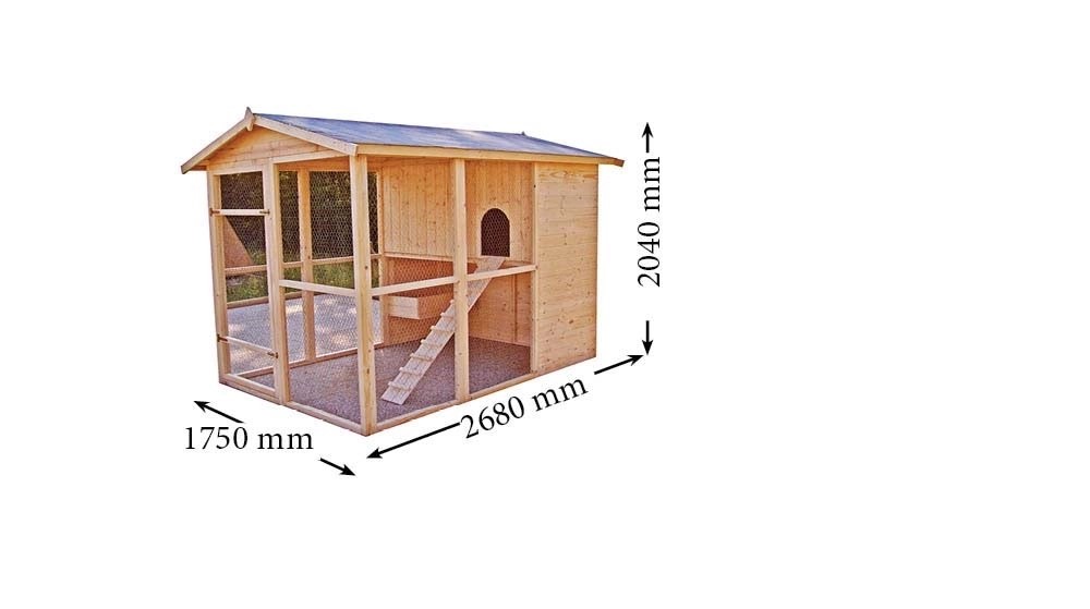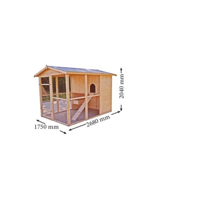 Questo ampio pollaio in legno naturale è progettato su due piani e offre una superficie di circa 3,90 m², ideale per ospitare comodamente 6-10 polli. Le pareti, spesse 16 mm, garantiscono robustezza e isolamento, mentre il legno certificato FSC assicura sostenibilità e qualità. La copertura del tetto è in guaina ardesiata di colore scuro e apribile tramite cerniere in acciaio inox, per un facile accesso e una buona ventilazione.