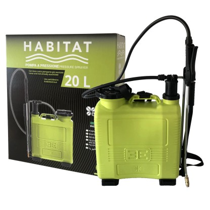 Pompa a zaino da 20 litri, pompante in plastica, lancia curva con ugello ottone, guarnizioni in NBR e spallacci regolabili con rinforzo.