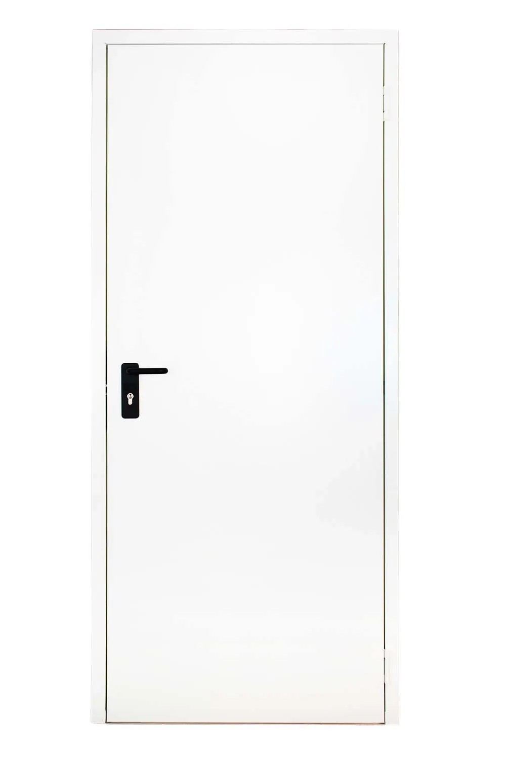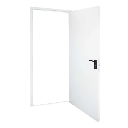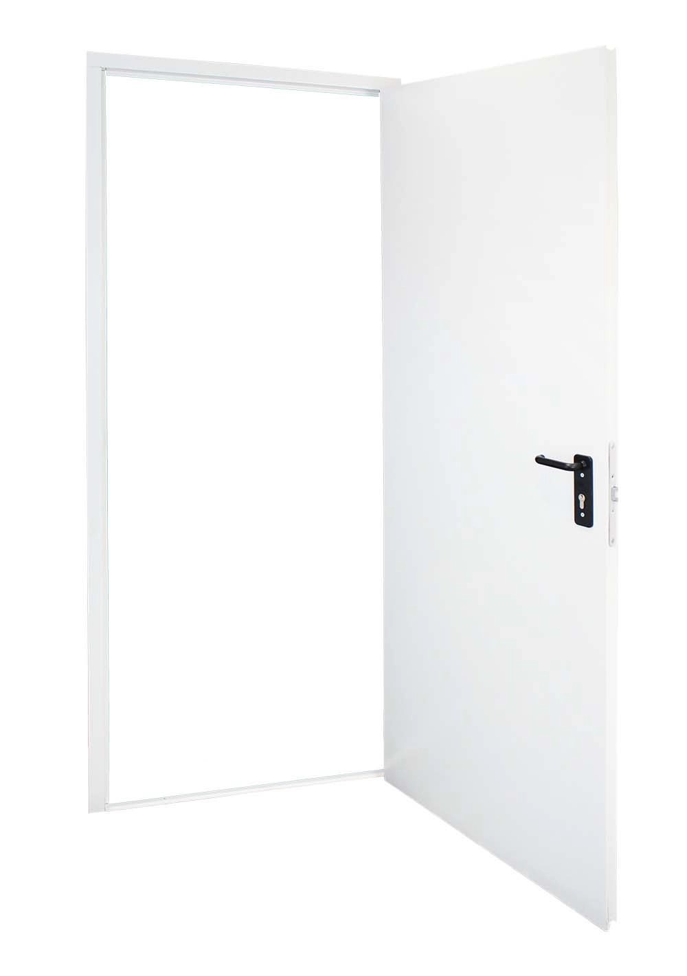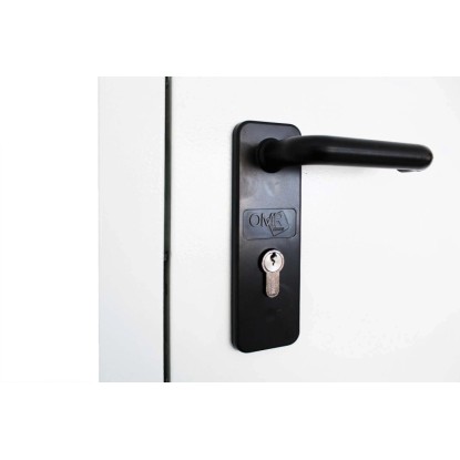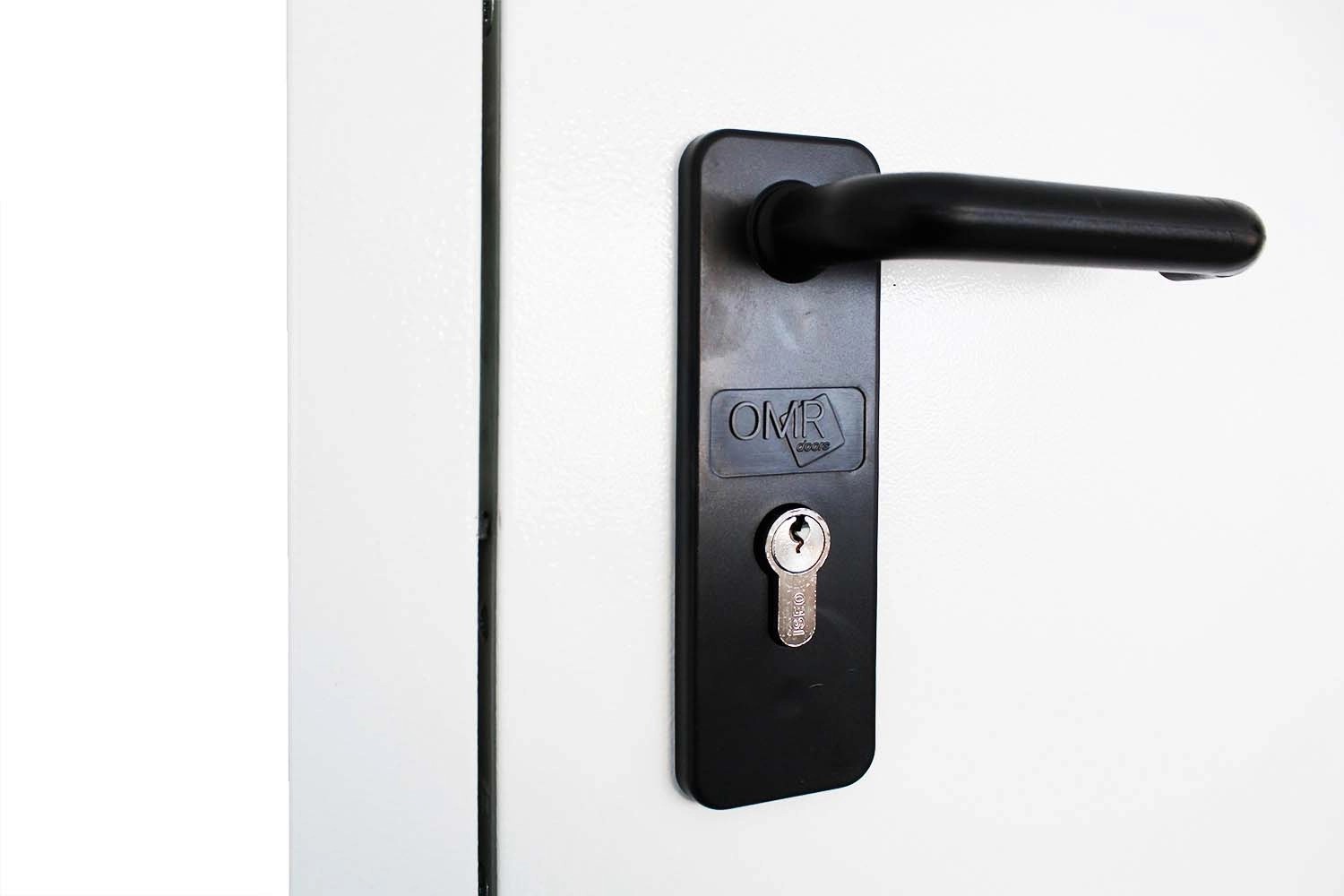 Porta multiuso tamburata, zincata e verniciata a polveri in tinta RAL 9010 goffrato antigraffio. Completa di maniglie e cilindro con tre chiavi in dotazione. Porta completamente reversibile anche a posa avvenuta.