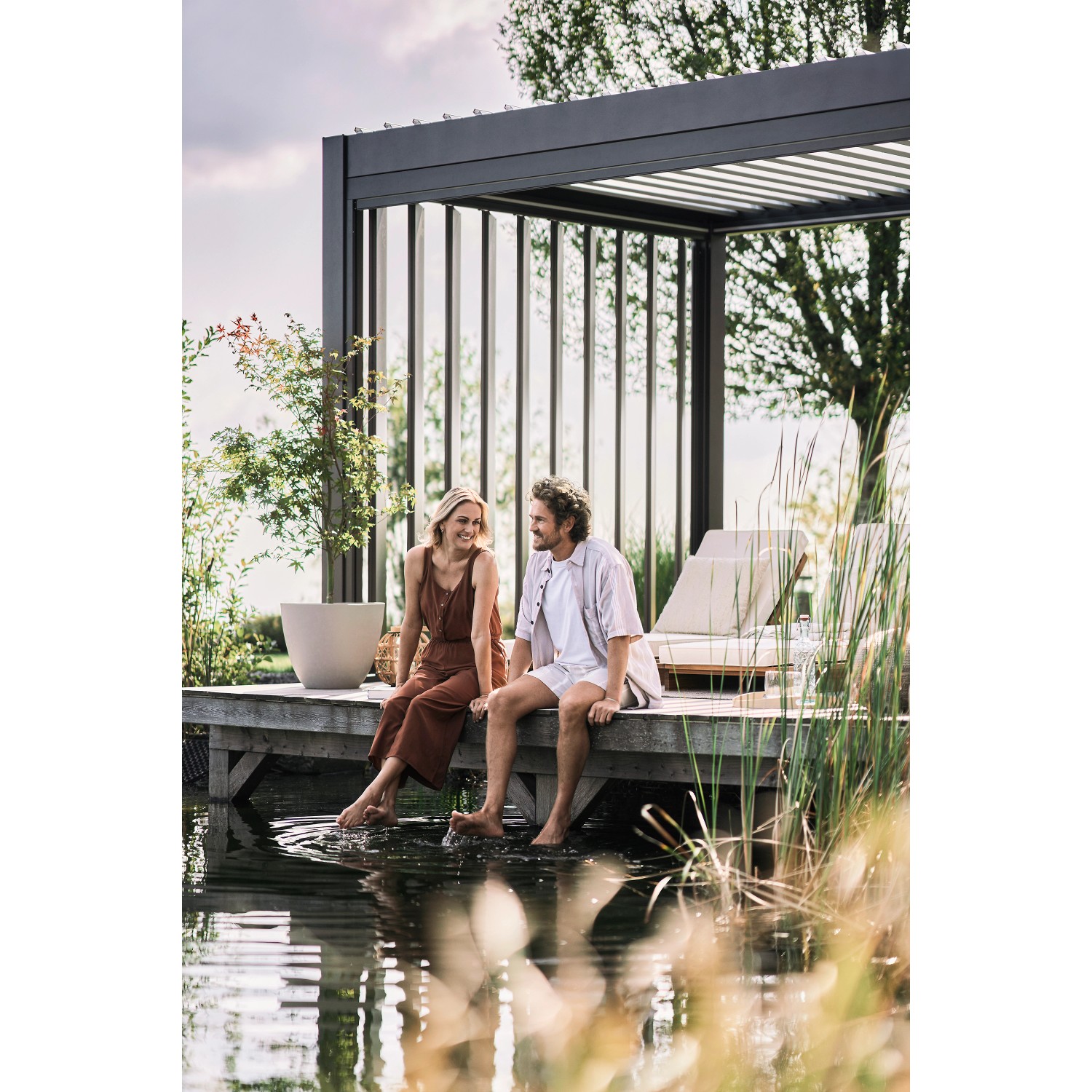 La Parete laterale a lamelle per pergola Biohort in Grigio quarzo metallizzato per la pergola della dimensione di 3 m è il completamento ideale per il tuo spazio esterno. Può essere regolata manualmente e offre una protezione affidabile contro il vento e le intemperie.
