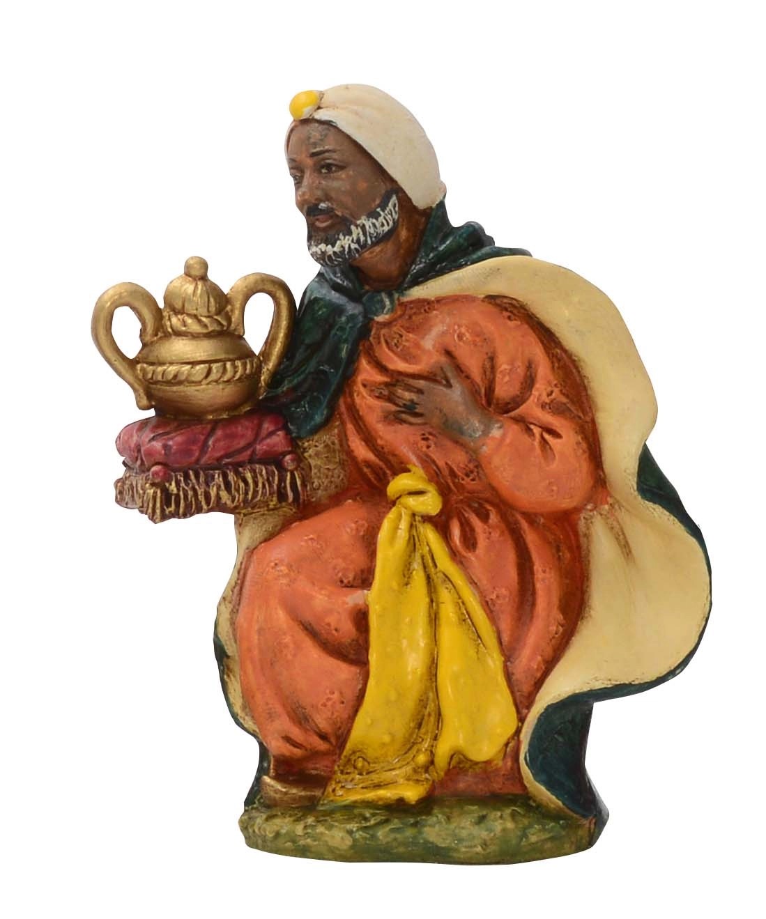 Questo Re Mulatto dei Magi, pitturato a mano con colori atossici, rappresenta il continente asiatico. Uomo di mezza età, è giunto al cospetto di Gesù su un cammello, come gli altri Re Magi. Porta con sé un vaso di incenso, simbolo di preghiera e sacrificio, aggiungendo un elemento di spiritualità e devozione alla scena natalizia.