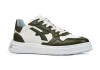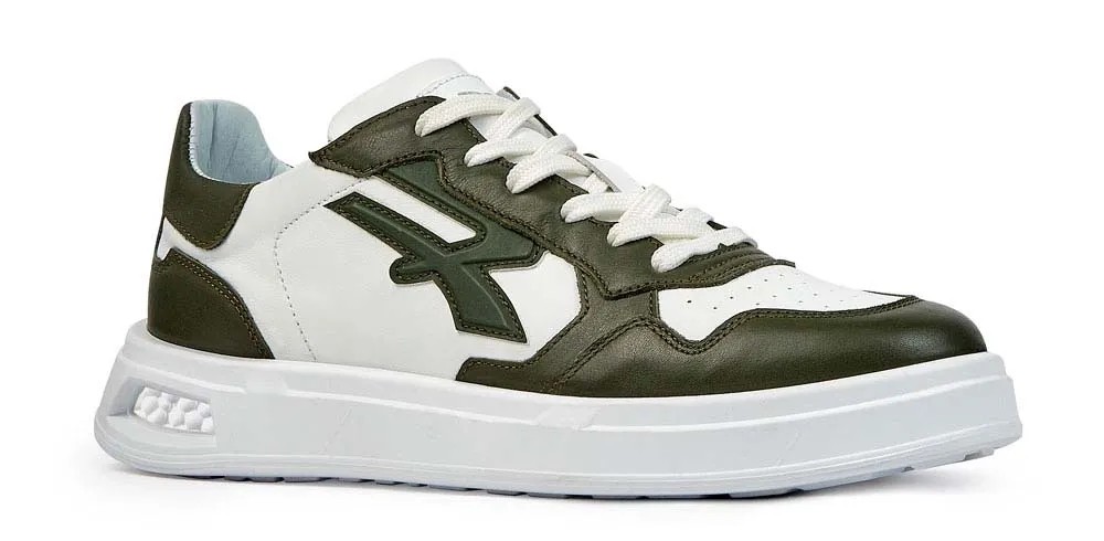 Questa sneaker antiscivolo con tomaia, sottopiede e linguetta in morbida pelle bianca è valorizzata dai riporti in microfibra verde.