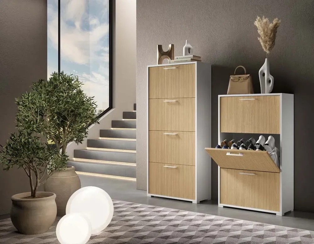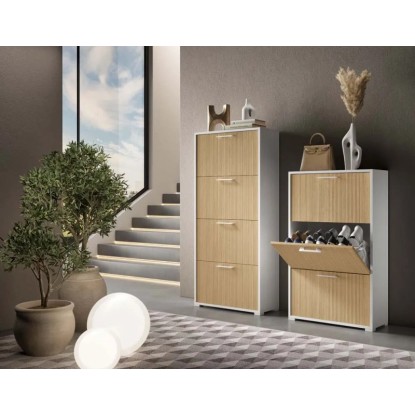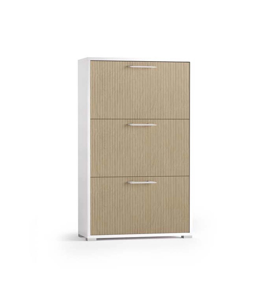 La scarpiera a 3 ante doppia profondità, con dimensioni di 67x28x112 cm, può contenere fino a 18 paia di scarpe.