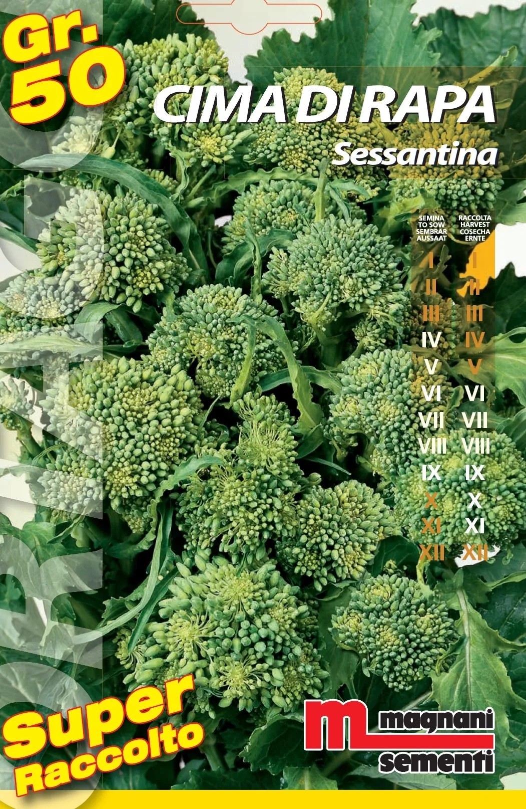 Cima di rapa è una varietà medioprecoce con infiorescenze di buone dimensioni e foglie molto frastagliate di colore verde medio. Il suo ciclo vegetativo dura 60 giorni. La distanza di diradamento o trapianto consigliata è 10 cm x 20 cm. Si consiglia una semina a file direttamente in pieno campo, ed essendo una pianta molto rustica non necessita di particolari cure.