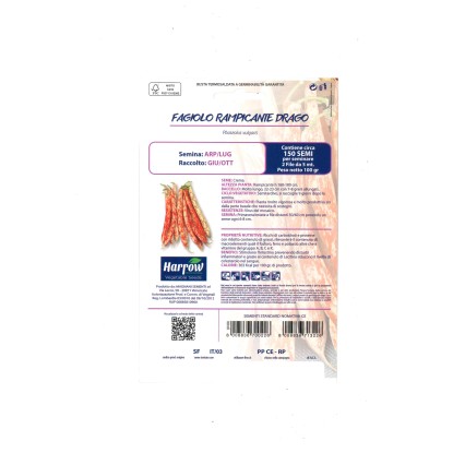 Il Fagiolo Rampicante Borlotto Drago è una pianta vigorosa e altamente produttivasin dalla parte basale che richiede sostegni per la crescita, poiché può raggiungere un`altezza di 160-180 cm. Produce baccelli di circa 22-23 cm di lunghezza contenenti 7/8 grani.