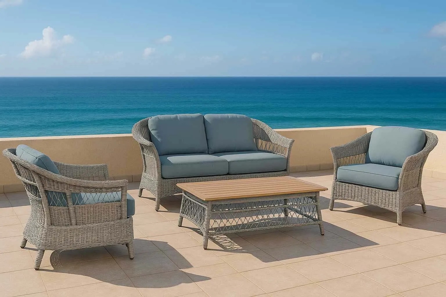 Salotto con struttura in alluminio con intreccio in polirattan grigio. Cuscini idrorepellenti con spessore 10 cm. Misure: - 2 poltrone cm77,5x77,5h85 - Divano a 2 posti cm134,6x77,5h85 - Tavolino cm90x60,3h44,5. Arreda il tuo giardino con soluzioni eleganti e confortevoli, ideali per creare ambienti accoglienti e vivere al meglio l`aria aperta. Ideali per esterni e interni, i nostri set valorizzano portici, salotti e taverne offrendo comfort, durata e uno stile sempre attuale.