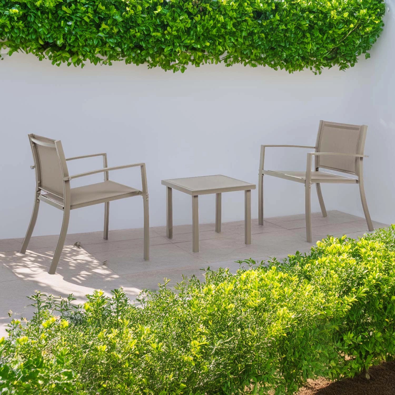 Il set da esterno Auri è la scelta perfetta per arredare con stile e praticità il tuo balcone, terrazzo o giardino. Realizzato in acciaio verniciato con una raffinata finitura color tortora, questo set è composto da due sedie e un tavolino coordinato. Il design compatto ed essenziale lo rende ideale per piccoli spazi, senza rinunciare a comfort e funzionalità per i tuoi momenti all`aperto.