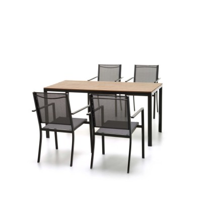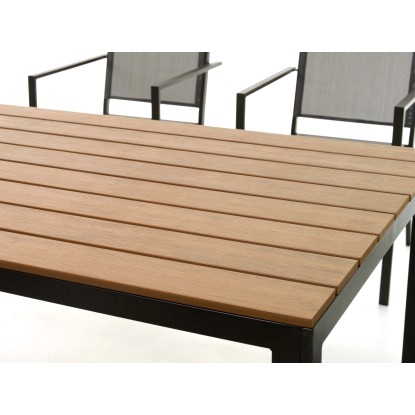 Il tavolo e sedie da giardino in ferro antracite compongono il Set da pranzo per esterni Oregon. Con un tavolo e 4 sedie, questo set è progettato per essere utilizzato in spazi esterni come balconi o terrazze, offrendo un luogo accogliente per pranzi o cene all`aperto. Il set Oregon presenta un design moderno ed elegante, che aggiunge personalità e stile alla decorazione del tuo spazio esterno. La struttura in ferro verniciato a polvere epossidica di colore dark brown si combina armoniosamente con il piano a doghe in "Polywood" di colore Teak, conferendo un aspetto sofisticato al set.