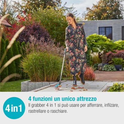 La pinza 4 in 1 GARDENA è uno strumento versatile e utile per mantenere il giardino in perfetto ordine. Consente di afferrare, infilzare, raschiare e rastrellare i rifiuti con facilità, garantendo un uso ergonomico.