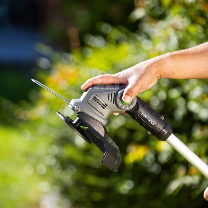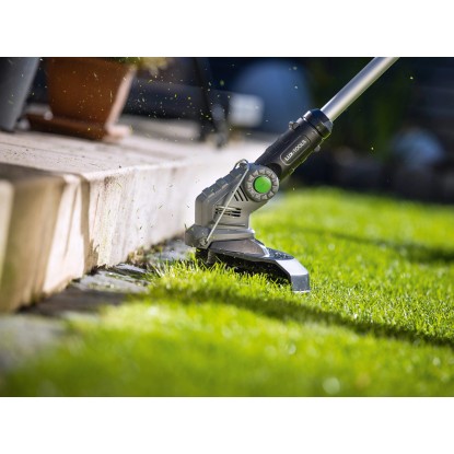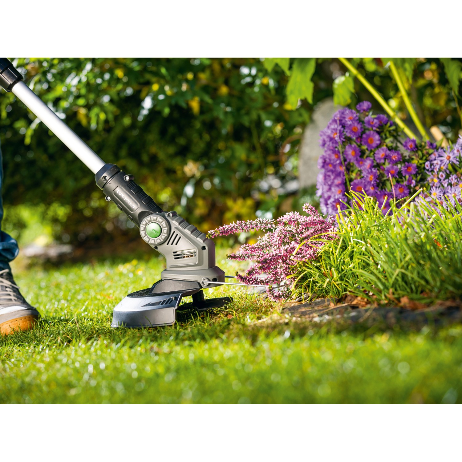 Per un rapido avanzamento dei lavori di falciatura, il dispositivo ha un diametro di taglio di 26 cm. Per proteggere le aiuole e i fiori durante il taglio, il dispositivo è dotato di una protezione per piante. Il tagliabordi a batteria è inoltre dotato di una testa di taglio inclinata girevole che permette di modificare l`angolo di inclinazione. In questo modo potrai accedere facilmente anche in punti difficilmente accessibili.