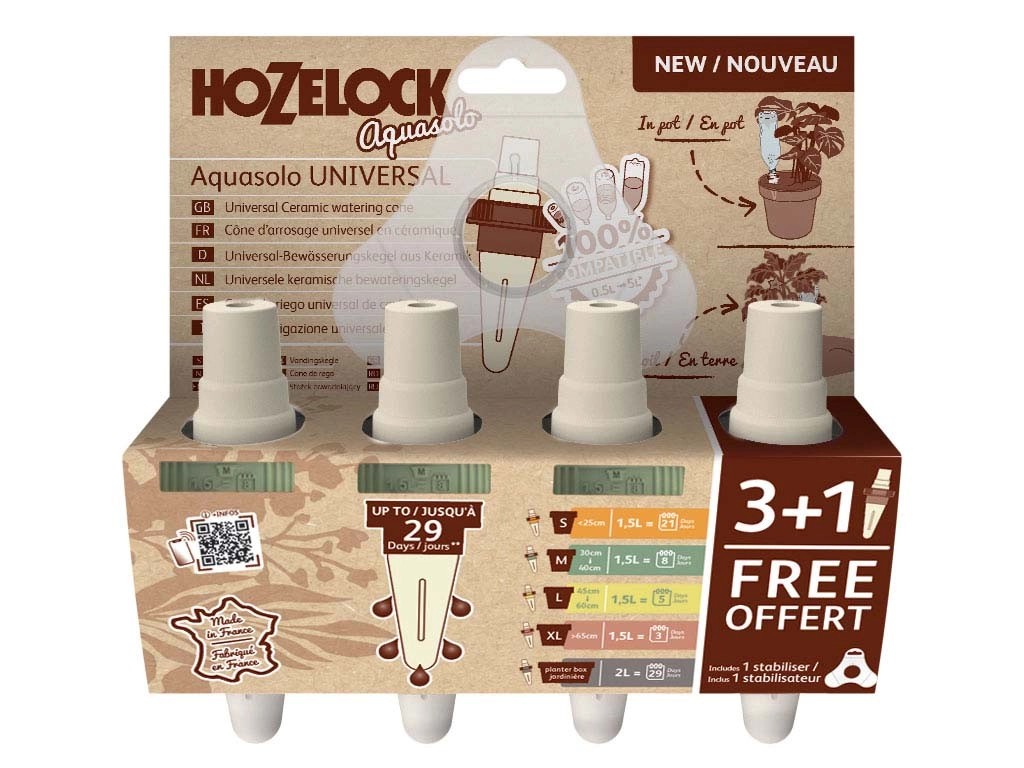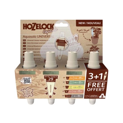 Disponibile in diversi modelli per scegliere la giusta porosità in base alle proprie esigenze. La confezione da 4 coni, include uno stabilizzatore per una migliore tenuta verticale delle bottiglie di grande capacità. La versione Aquasolo M è ideale per vasi di 30-40 cm di diametro, per un tempo di irrigazione massimo di 28 giorni a seconda della dimensione della bottiglia. Adatto per innaffiare piante in vaso in casa o all`esterno.