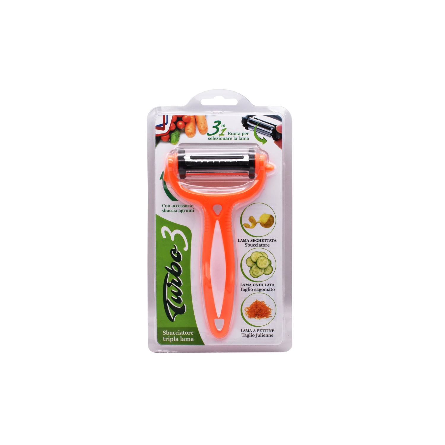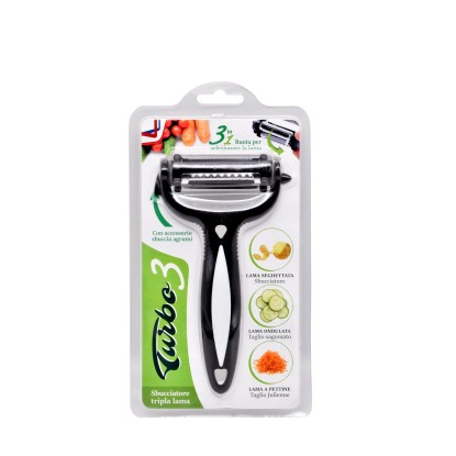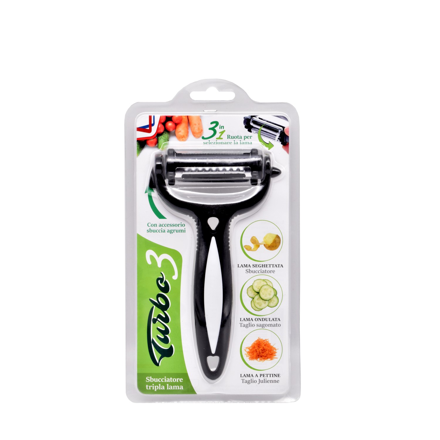 Lo sbucciatore tripla lama é pratico e facile da utilizzare. Ideale per tagliare, sbucciare e guarnire, basta ruotare il selettore laterale per selezionare la lama.