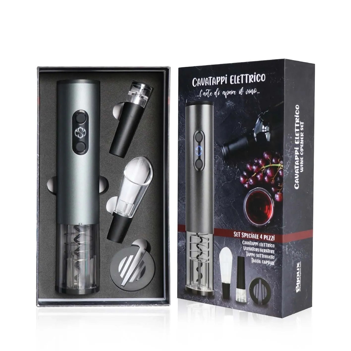 Set regalo speciale con cavatappi elettrico e accessori, perfetto per gli amanti del vino. Il cavatappi elettrico permette un`apertura semplice e rapidissima grazie ai due pulsanti dedicati, garantendo l`estrazione del tappo in sole due mosse. Compatibile con la maggior parte delle bottiglie di vino, rimuove senza sforzo sia tappi naturali che sintetici. Funziona con 4 batterie AA (non incluse). Il set comprende tagliacapsule, versatore - aeratore e tappo sottovuoto per preservare al meglio il vino aperto.