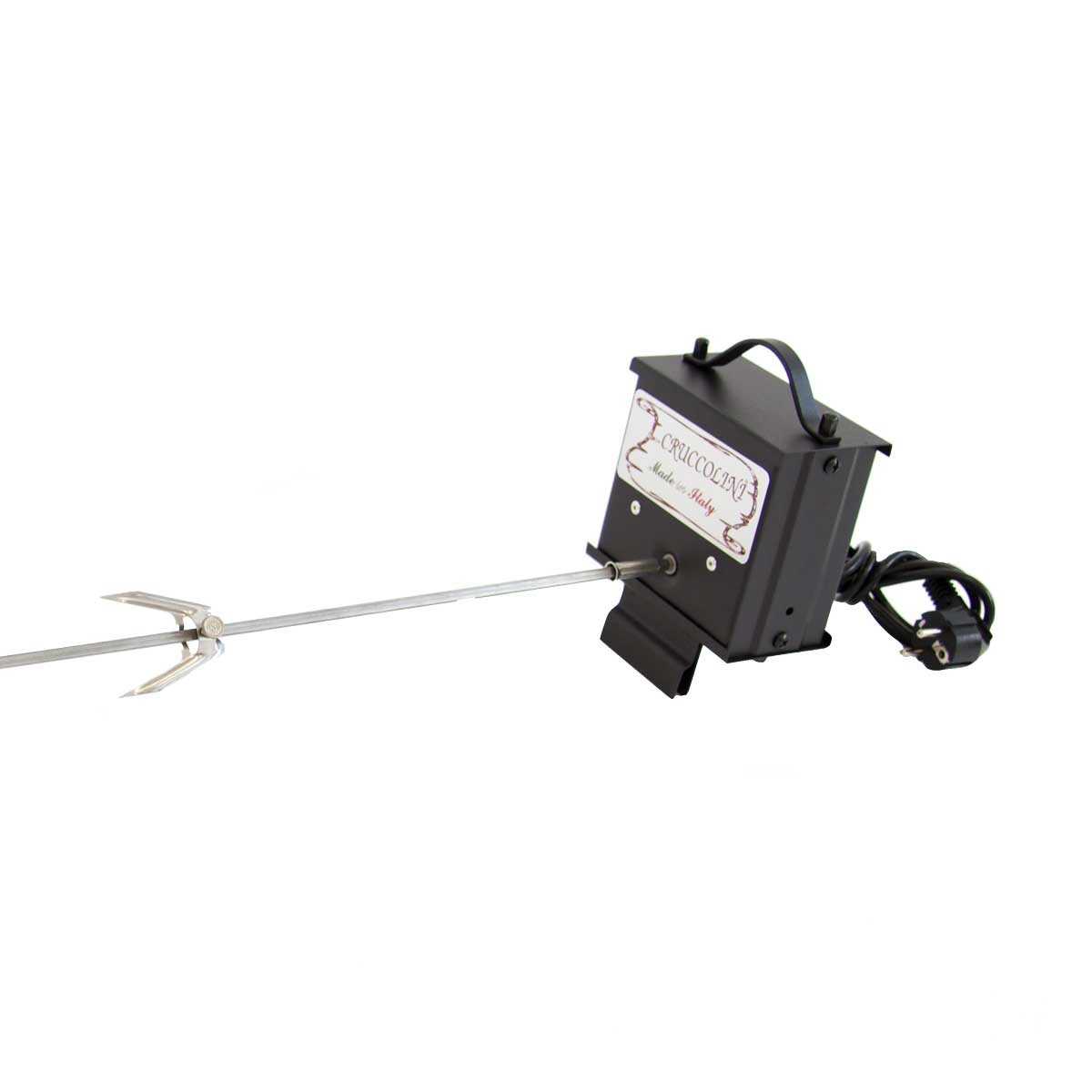 I girarrosto elettrici da barbecue Cruccolini sono caratterizzati dalla loro robusta struttura in ferro e dal motore elettrico da 220V. Compatibile con tutti i barbecue dai bordi verticali di lunghezza massima 90 cm, è uno strumento pratico ed utile che permette una cottura dei cibi uniforme a fuoco lento senza bisogno di sorvegliarli costantemente. Il kit comprende un girarrosto elettrico, uno spiedo in acciaio inossidabile con forchette di trascinamento ed un supporto per spiedo.