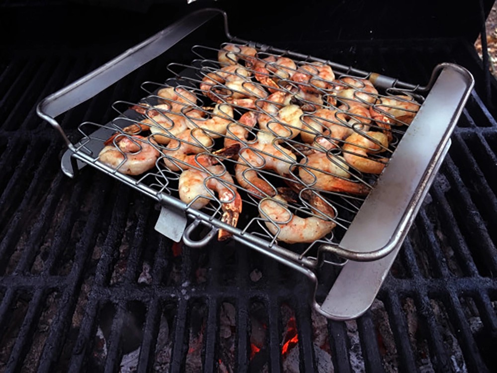 Griglia a molla in acciaio inox per barbecue, ideale per cuocere il pesce.