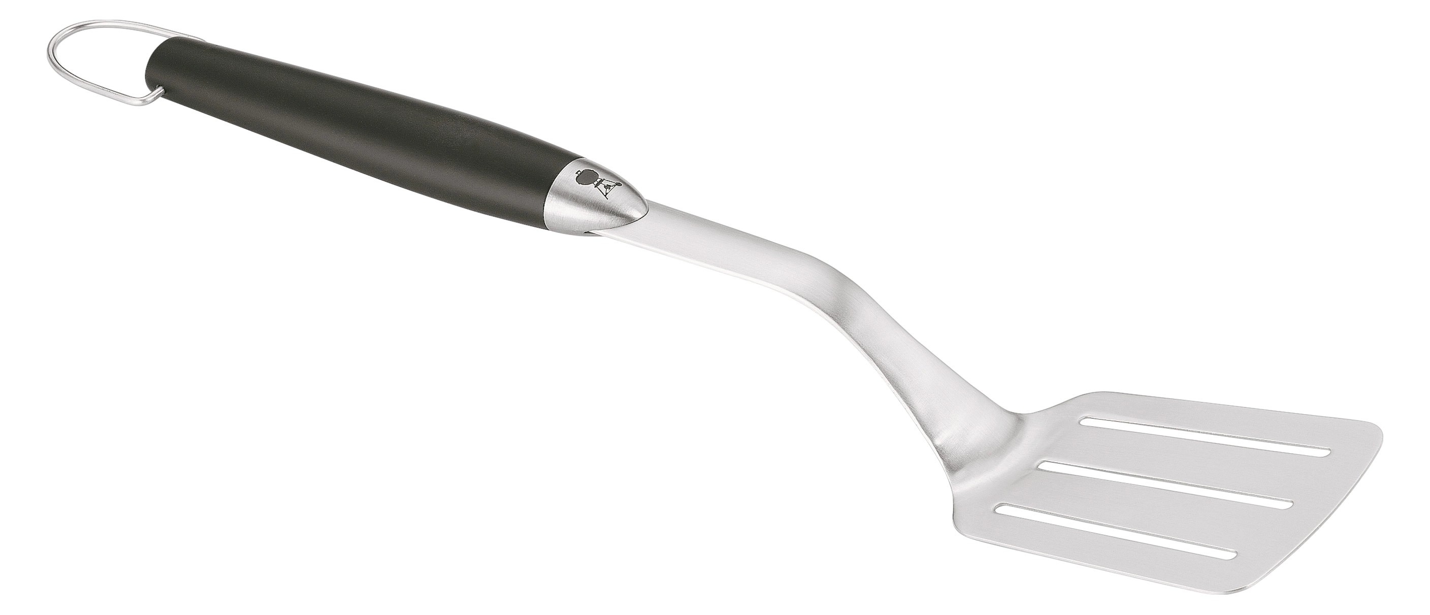 Spatola in acciaio inossidabile Weber, indispensabile per girare i cibi di medie e grandi dimensioni. Provvista di un utile gancio in modo da appenderla e averla a portata di mano.