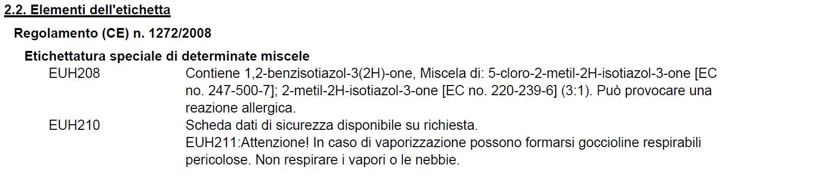 | | EUH208 | (00|EUH211: Attenzione! In caso di vaporizzazione possono formarsi goccioline respirabili pericolose. Non respirare i vapori o le nebbie.|)